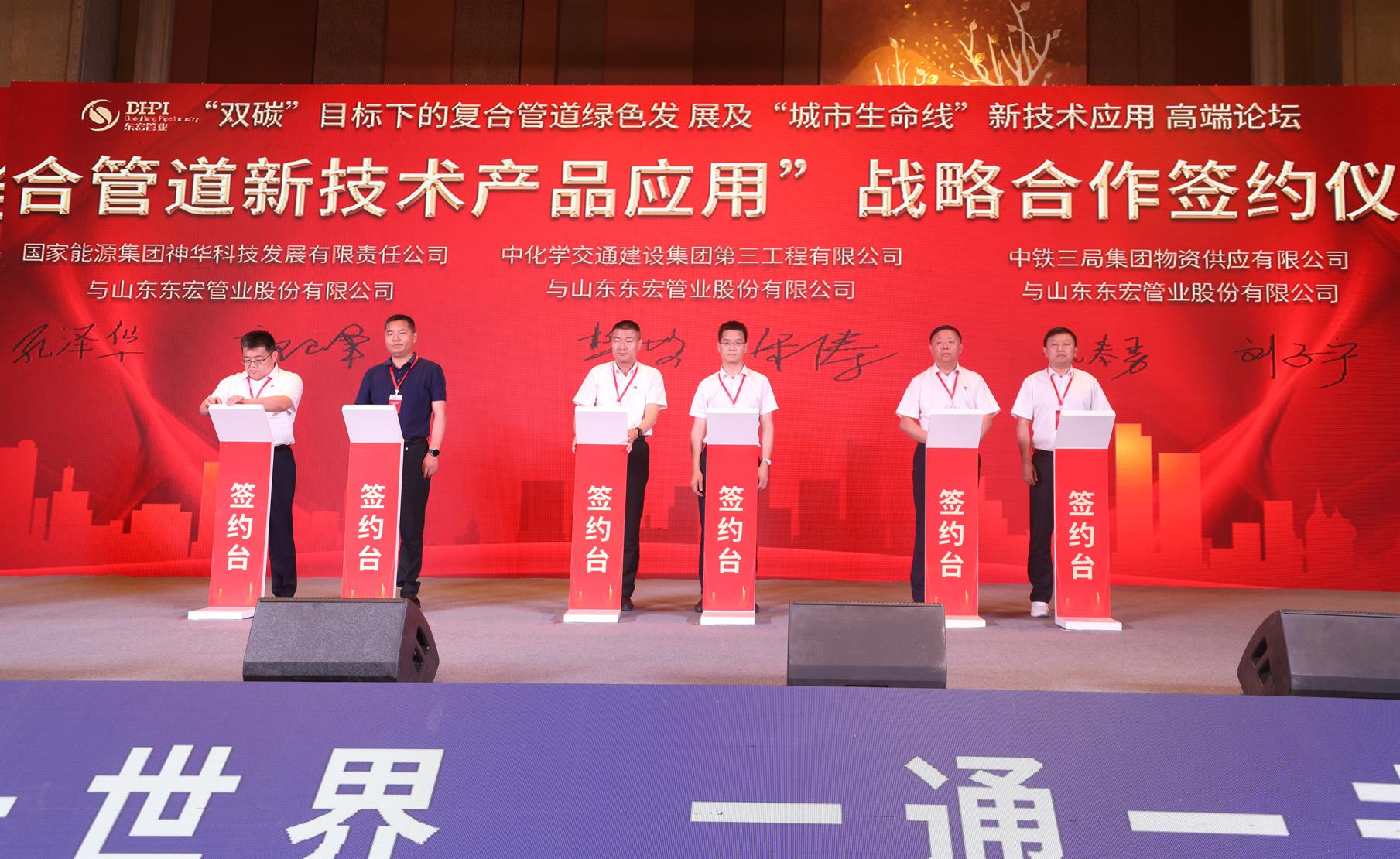 在8位業(yè)內(nèi)領(lǐng)軍專家的精彩分享之后,本次論壇進(jìn)入成果轉(zhuǎn)化環(huán)節(jié),多家領(lǐng)域內(nèi)代表性設(shè)計(jì)院和頭部企業(yè)與東宏股份進(jìn)行了“復(fù)合管道新技術(shù)產(chǎn)品設(shè)計(jì)”戰(zhàn)略合作簽約儀式和“復(fù)合管道新技術(shù)產(chǎn)品應(yīng)用”戰(zhàn)略合作簽約儀式。